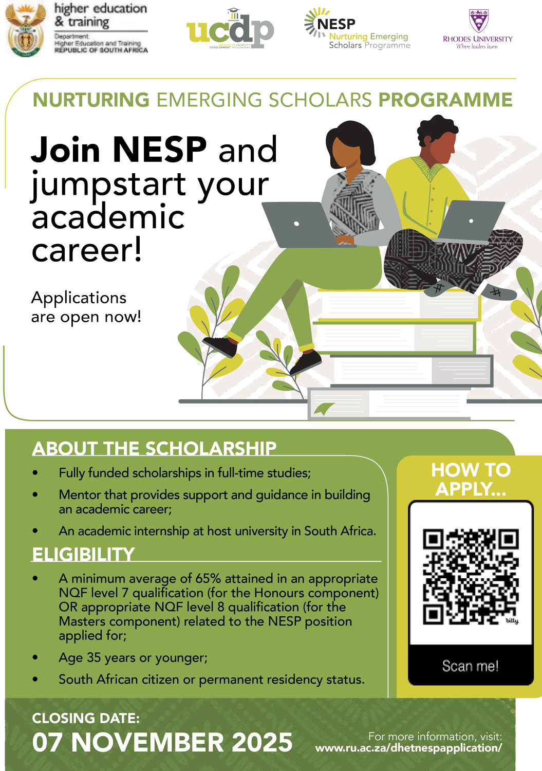 Are you a South African citizen or permanent resident under the age of 35, with a strong academic record (65%+ average) in a relevant field? The Nurturing Emerging Scholars Programme (NESP) is now accepting applications for 2026 and you could be one of the next scholars to receive a fully funded scholarship to pursue your academic dreams,