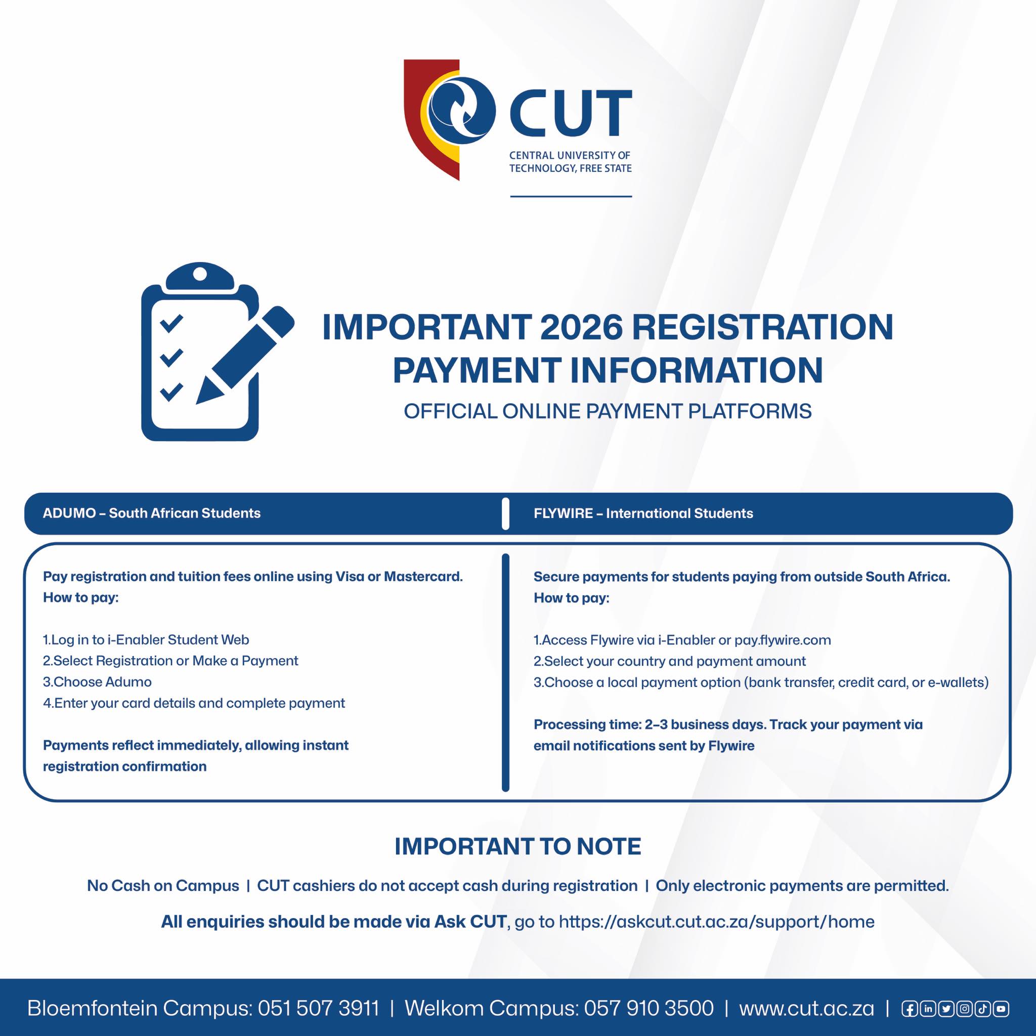 To secure your place for the upcoming academic year, all returning and new students, both South African and international, are required to pay the Minimum Initial Payment (MIP) by the published registration deadline.