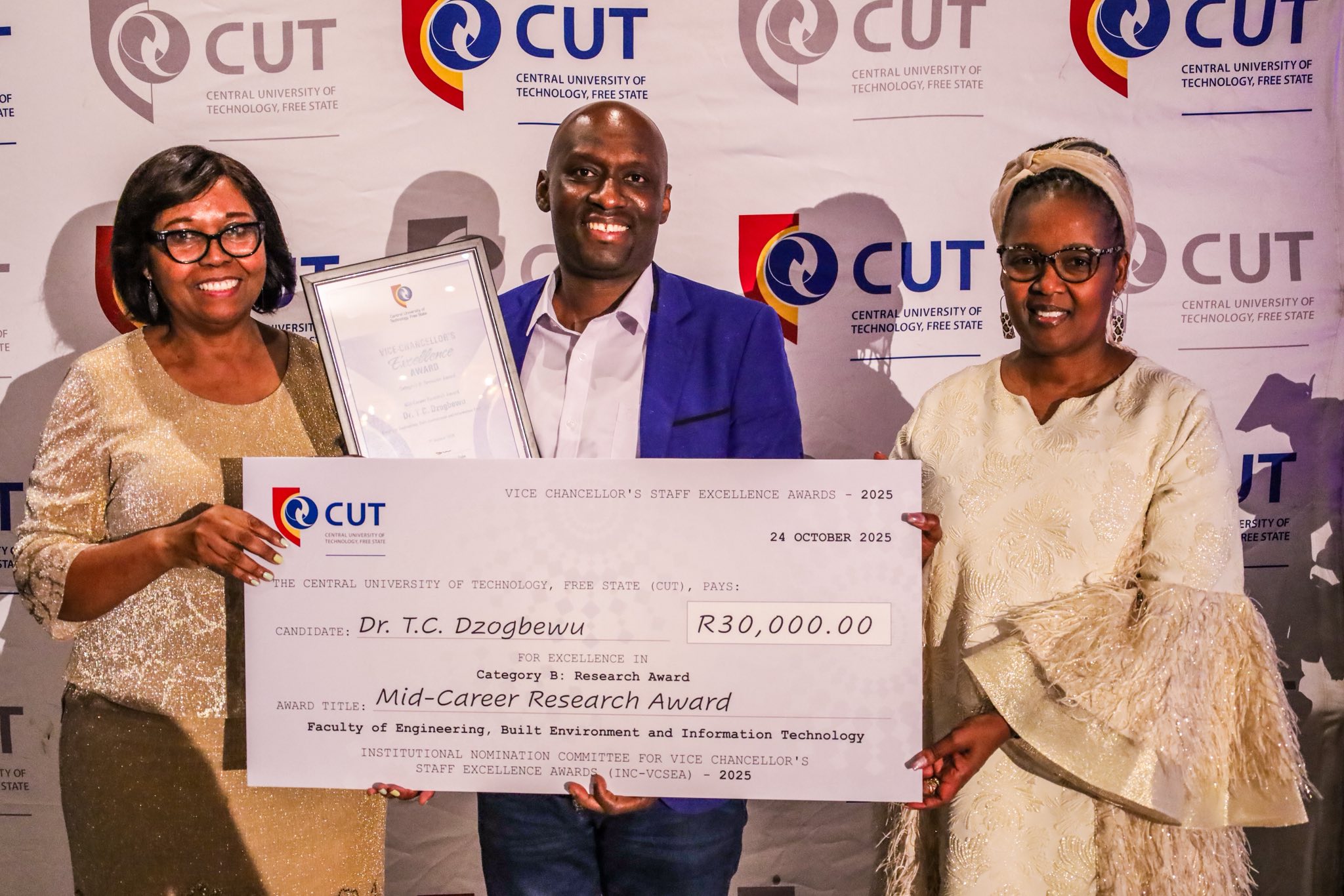 Dr. Thywill C. Dzogbewu proudly received the Vice-Chancellor’s Mid-Career Award for 2025 in recognition of his outstanding contributions to multidisciplinary materials engineering research, innovative green manufacturing, and his impactful leadership in bridging academic discoveries with real-world industrial applications. Handing over the award is Prof. Wendy Setlalentoa, Acting DVC: Research Innovation and Engagement (L) and Prof. Pamela Dube, Vice-Chancellor and Principal (R).