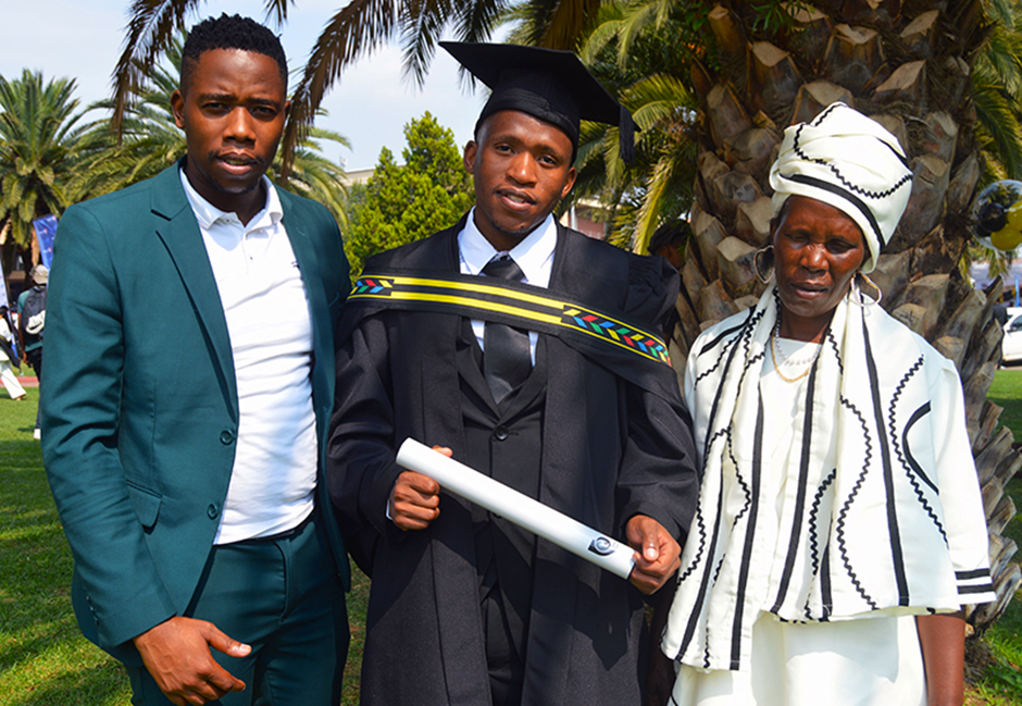 From left: Masimbonge Bhokoloshe, his brother Yathi Bhokoloshe (CUT Education graduate), and their mother Ms Noncedikhaya Cornelia Bhokoloshe at Yathi’s Autumn Graduation earlier this year. Yathi, a proud CUT graduate and recipient of the ETDP SETA stipend, shared that the support programme opened doors for him to inspire, teach, and make a lasting impact in the classroom.