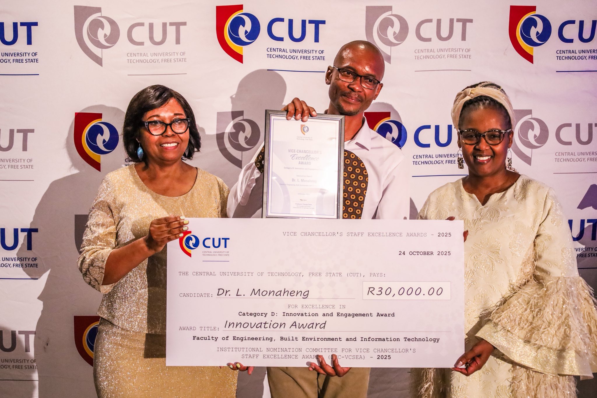 Teaching Award: Ms T Tshabadira; Research Award: Dr J Coetzer, Dr TC Dzogbewu and Dr C Chukwuma; Community Engagement Award: Ms I Kgololo Ngowi, Ms C Maasdorp, Ms B Mokgosi, Ms N Khoza, and Dr L Mosweunyane; Innovation and entrepreneurship Award: Dr L Monaheng; Support Staff Award: Ms Mapaseka Gladys Muso, Mr Malesela Matlawe, Mr Emmanuel Zungu and Dr Reynell van der Ross; Special Award: Ms Hannelie van der Walt (Living CUT Values) and Mr Sidumo Aubrey Rikhotso (Ethics Ambassador).