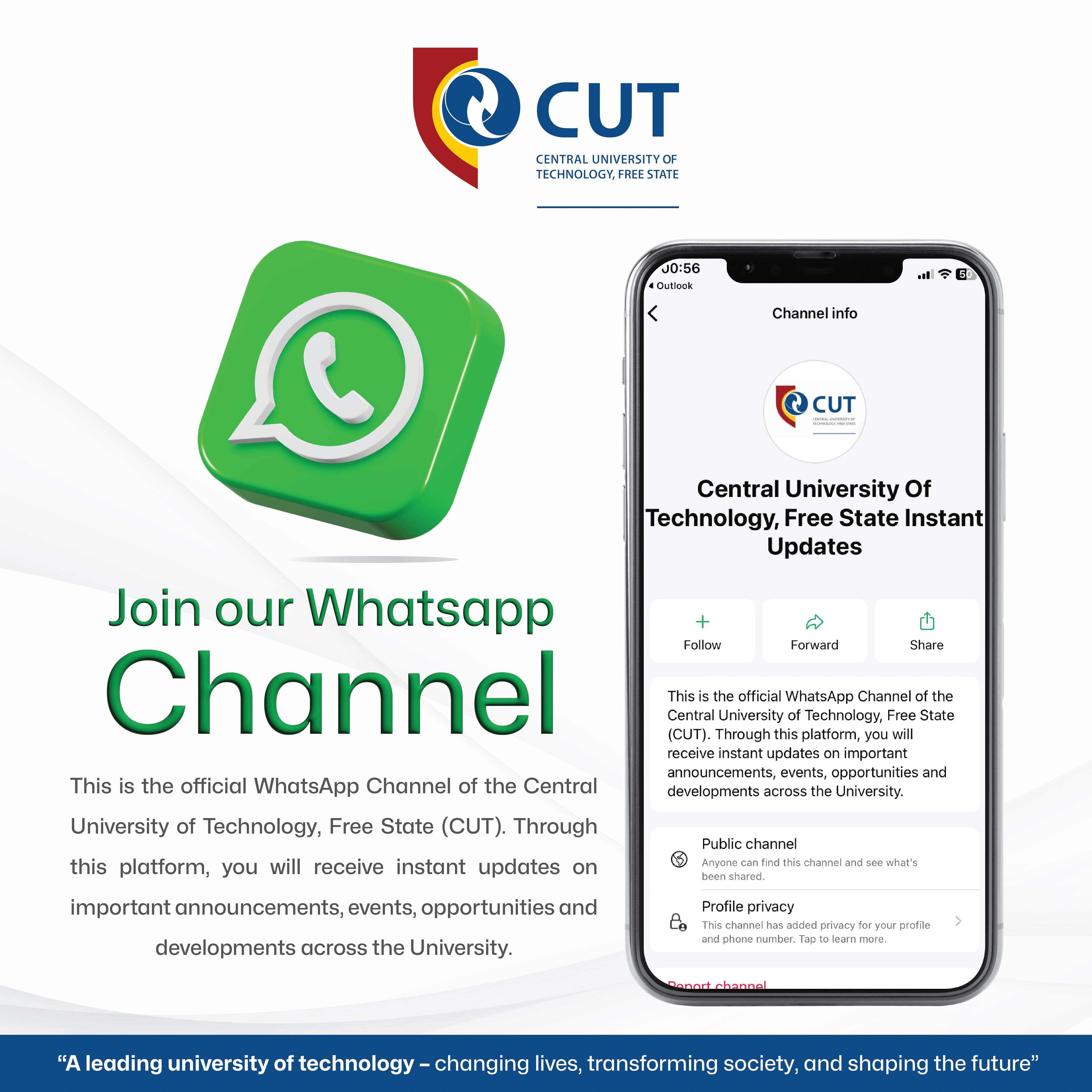 When engaging on the Central University of Technology, Free State (CUT) social network channels, our conduct should reflect the institutional values: Ubuntu, Integrity, Diversity, Innovation and Excellence. Read Social Media Code of Conduct.